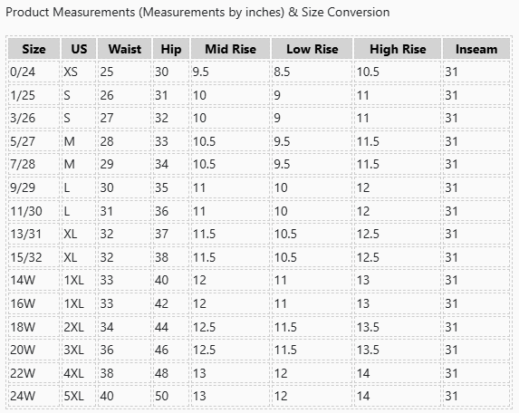 - Waist line: Mid waist
