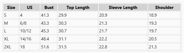 Size | US | Bust | Top Length | Sleeve Length | Shoulder |